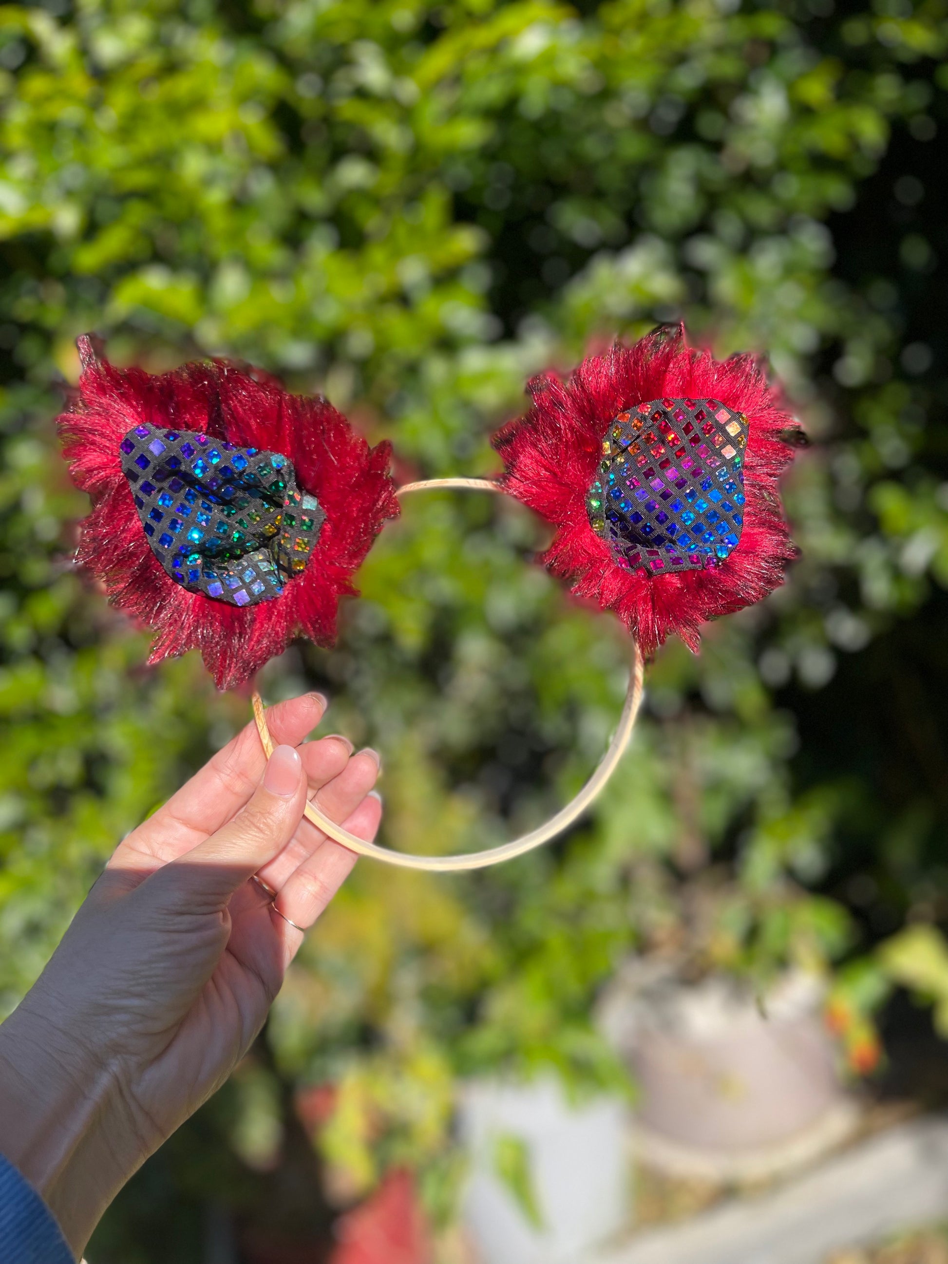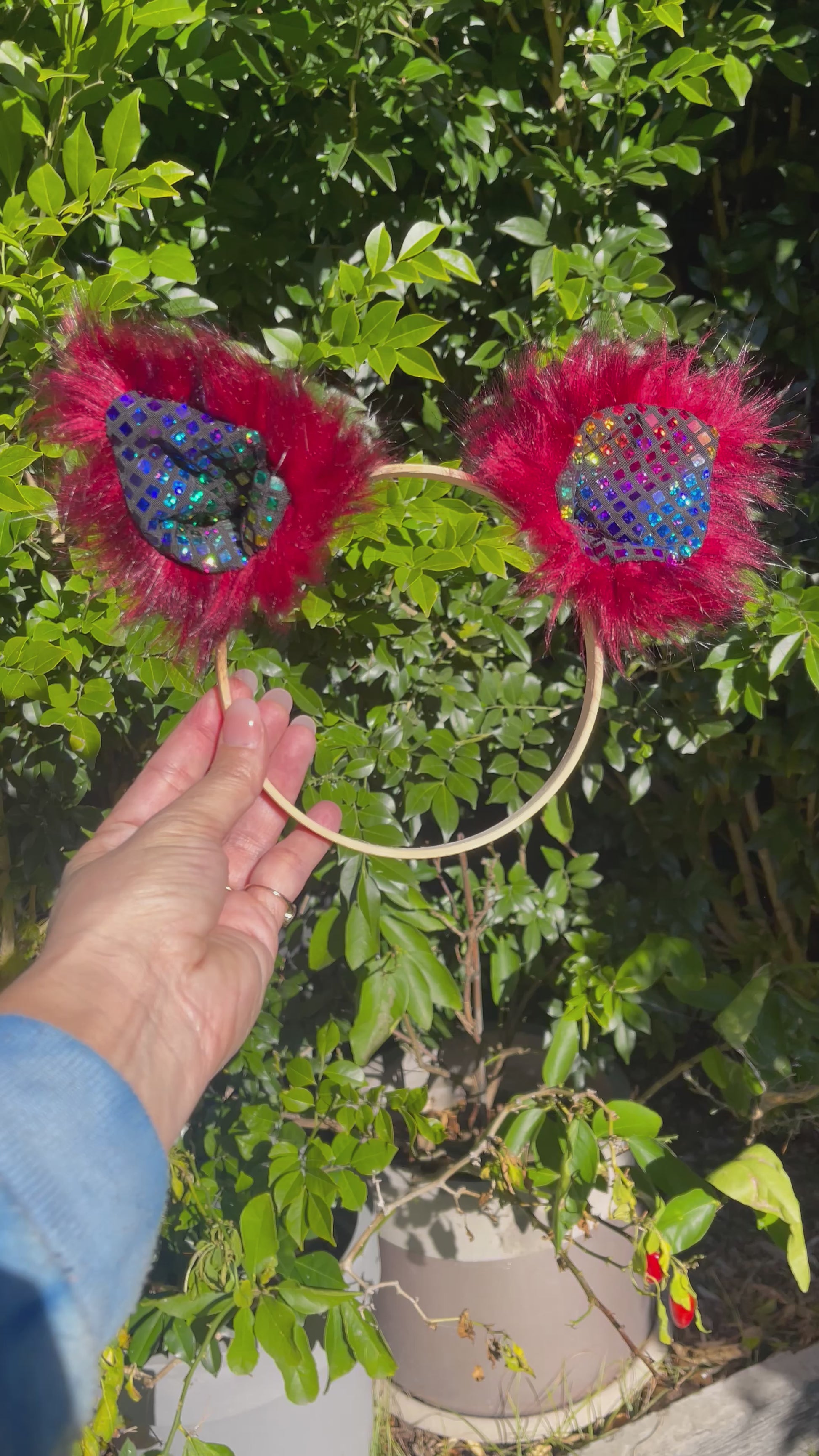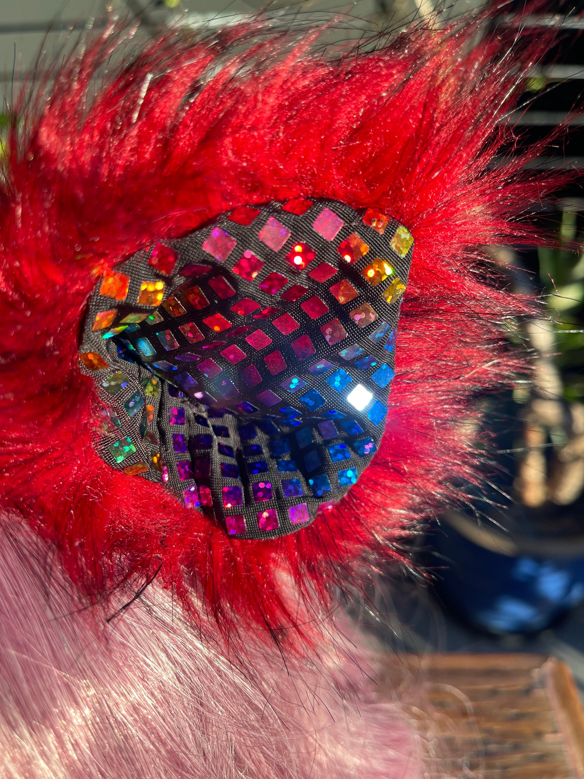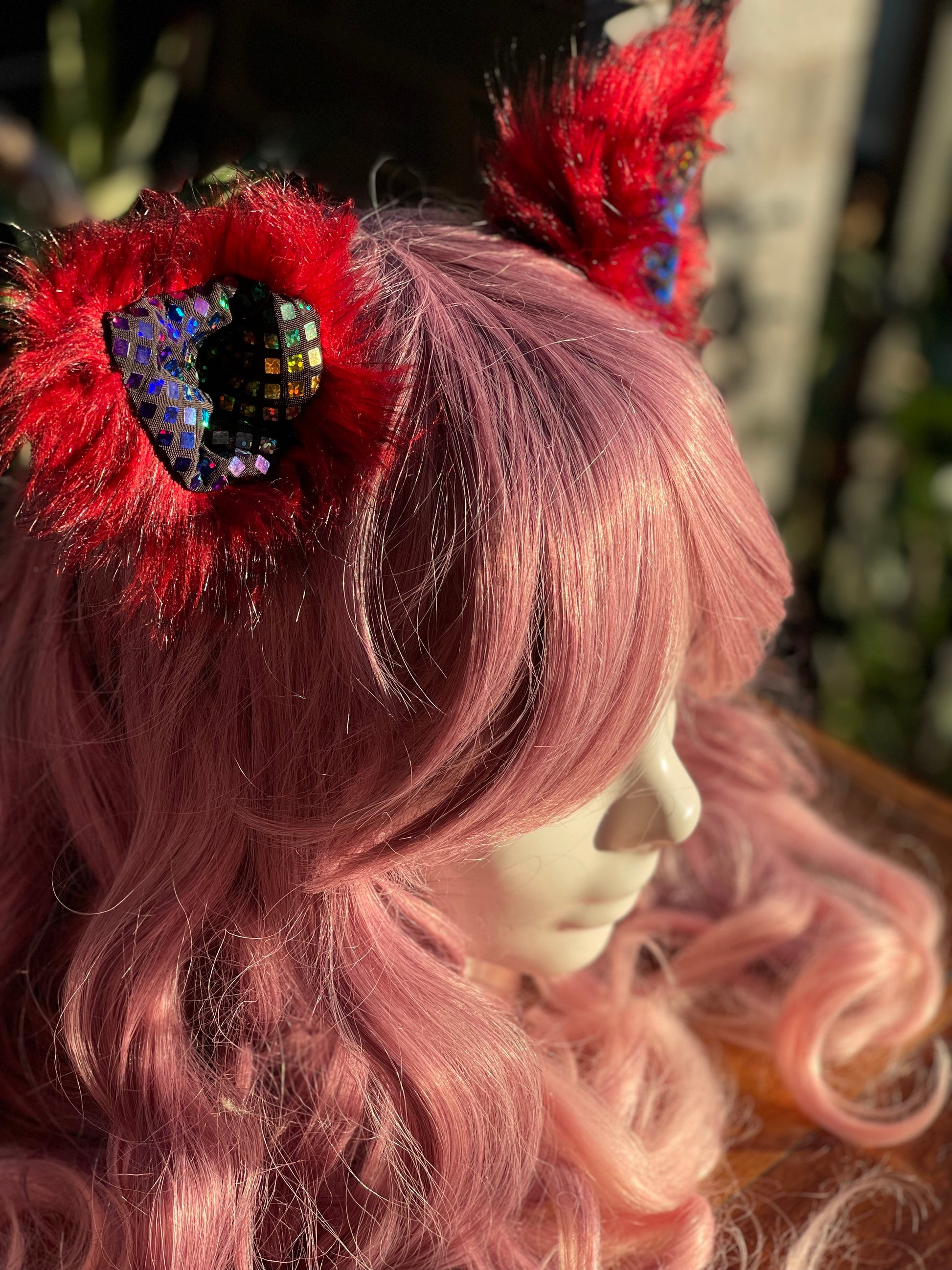 Homemade clip-in cat ears are a fun and unique accessory that can add some whimsy to any outfit or costume. These particular cat ears have a distinctive design featuring a rainbow-coloured disco ball inside the ear, which will catch the light and create a dazzling effect. The outside of the ears is made from soft and fluffy black faux fur, adding a touch of elegance and sophistication to the playful design.